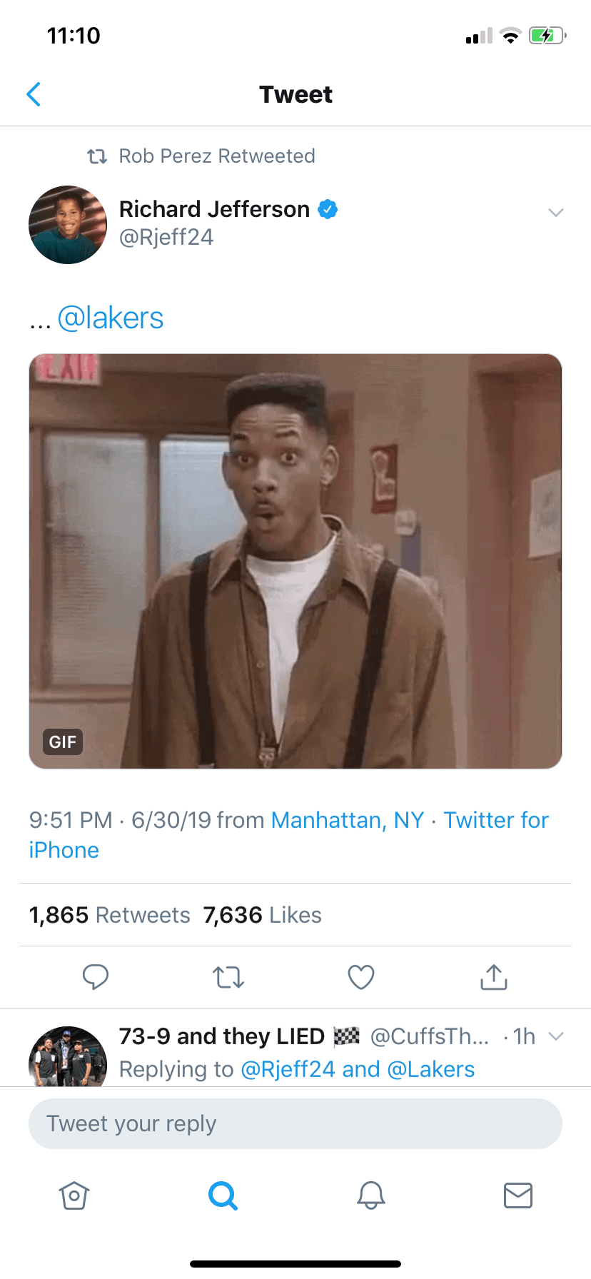 This is as of 11:04 pm. Kawhi is a free agent. Deangelo Russell has yet to pick a destination. I think those two are obviously related. The twitter sphere has posted some cryptic tweets by Richard Jefferson mentioning the lakers. I assume that means kawhi.