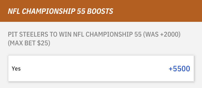 I am already on the Steelers at 25/1 to win the title and they are already down to around 22/1. I can add a little more at 55/1! Sign me up for the new Barstool Sportsbook account and this odds boost.
