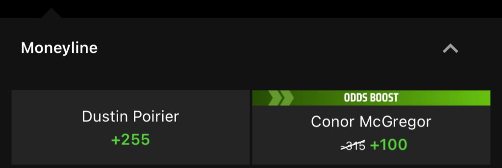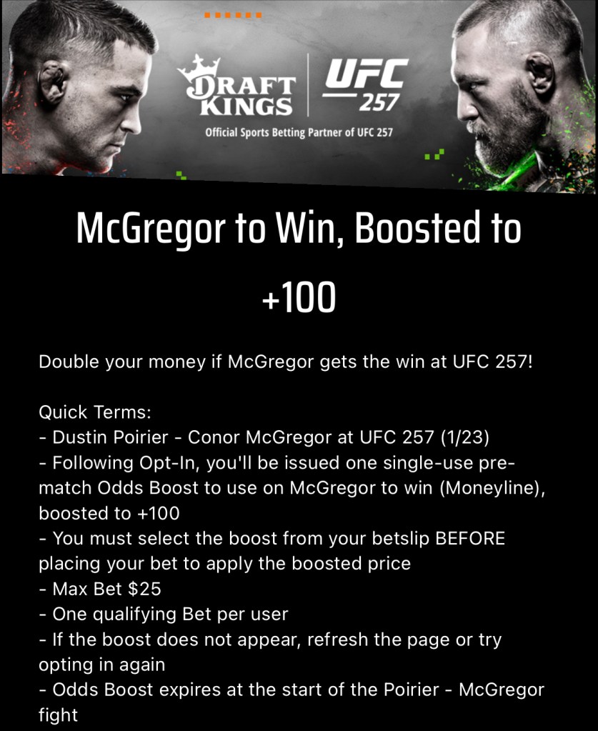 Draft Kings is offering the following boost on McGregor at +100 to win. This of course has a max bet of $25.