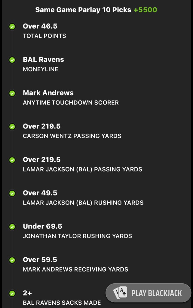 $25 Same Game Parlay is back! That means if you lose it is refunded as a $25 bet. Last week I turned one of these free bets into a SGP win! It has ten selections and did not fit on a screen shot completely! The last leg was the Colts to fumble.